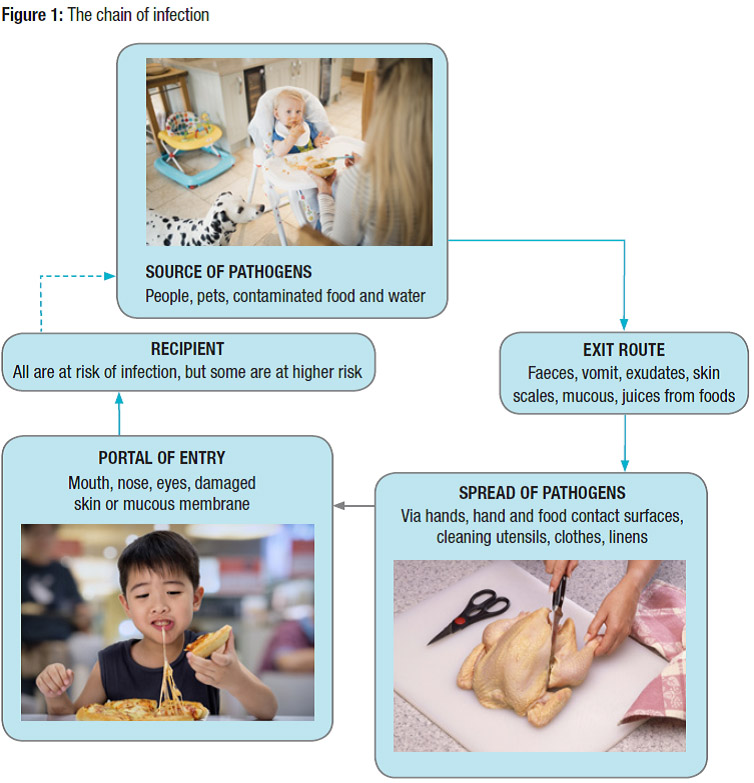 The International Scientific Forum on Home Hygiene promotes “Targeted Hygiene” as the best method to assess when hygiene is needed. The approach looks at sources of pathogens, routes of transmission, critical control points, and appropriate interventions to determine what course of action is best. Targeted hygiene subscribes to the concept of chains of infection, that need to be interrupted. It identifies the hands, hand contact surfaces, food contact surfaces, and cleaning utensils as presenting the highest risk of transmission. Since the presence of potentially harmful microbes in the home is inevitable, this means that the way to protect ourselves from infection is by stopping these critical moments as shown in Fig. 1.3