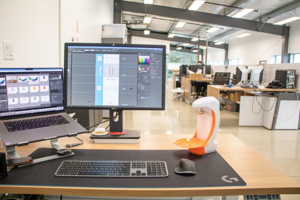 In a bright, elongated open office—a part of a newly built addition—engineers and designs work alongside each other. These teams create the technology and products that can be found in a majority of commercial dispensers in North America. Surrounded by clean, white walls and copious windows that fill the space with natural light, desks are often filled with dispensers, pumps, electronic components, and the devices used to test them. This room is a reflection of the spirit of OPHARDT: hygienic and professional, but still possessing that creative—and sometimes messy—drive that could be found in the garage where the company began.
