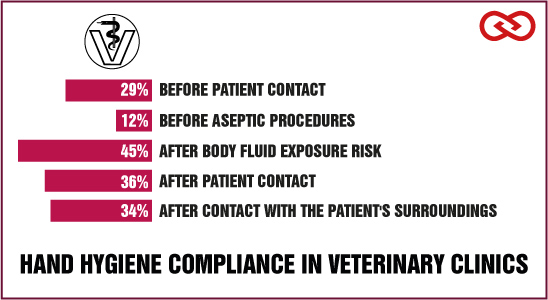 The results show that hand disinfection took place in only 32% of all required cases. Hand disinfeciton before aseptic activities—probably the most important indication from an infection perspective—fared the worst with a compliance rate of 12%. This disparity is consistent with previous studies on hygiene in veterinary medicine. [5]
