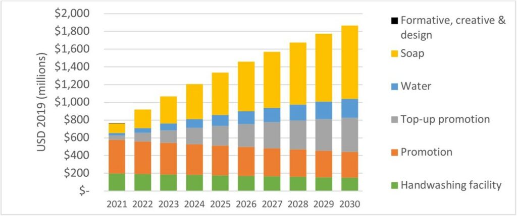 The breakdown of how much money would need to be spent on these one-time and ongoing promotions, handwashing facilities in people’s homes, and soap and water can be seen below: