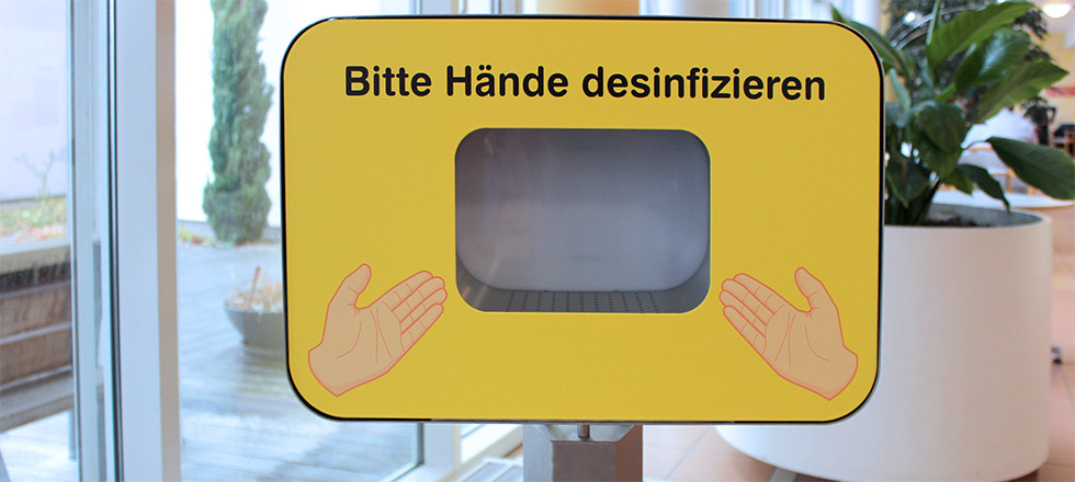 Das Sigma-Zentrum in Bad Säckingen ist ein positives Beispiel, wie die Händehygiene unter den Besuchern schon beim Eintritt in die Klinik an Aufmerksamkeit gewinnt. Dazu setzt die Einrichtung auf den Effekt von Farben und setzt PRAESIDIO® Desinfektionsmittelspender mit einer neongelben Frontbedruckung ein, die sofort ins Auge stechen und auch eine Botschaft für die Desinfektion bereithalten.
