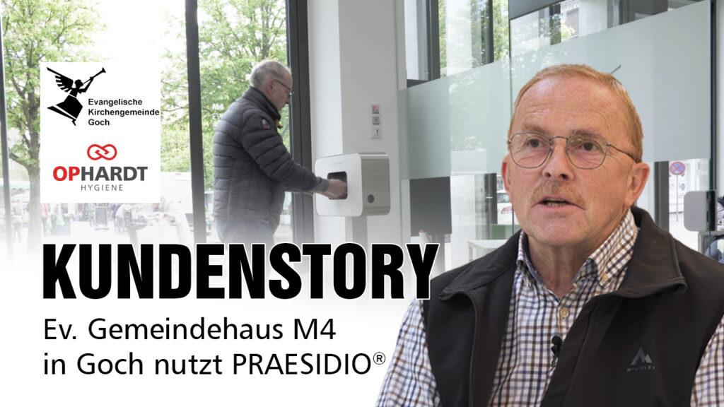 Hier steckt Leben drin: Das M4 in Goch ist das neue Begegnungshaus der evangelischen Gemeinde, das im Jahr 2020/2021 rundum saniert worden ist. Es ist eine Anlaufstelle für Jedermann und enthält für Jung und Alt reichlich Attraktionen bereit. Um dort den Besuchern hygienische Sicherheit zu bieten, hat sich die evangelische Gemeinde für einen PRAESIDIO® Desinfektionsmittelspender für den Eingangsbereich entschieden – und wir haben mit dem Küster der Gemeinde, Herrn Norbert Tiede, über die Vorteile des Spenders gesprochen.