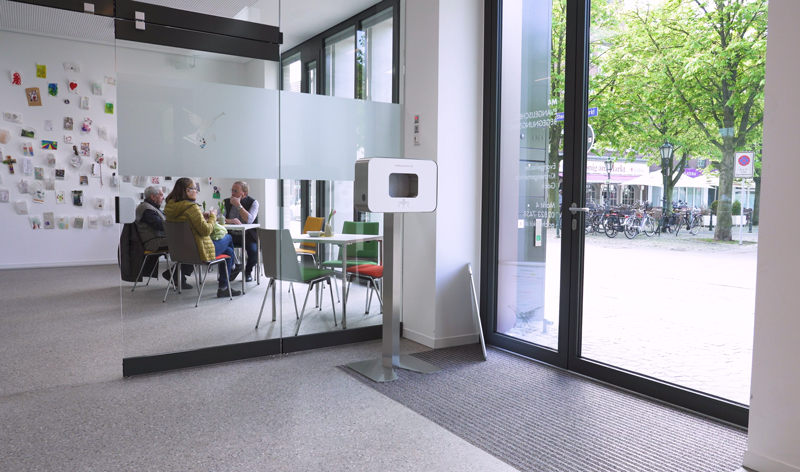 Der PRAESIDIO® steht gut sichtbar am Eingang. „Beim Eintreten sieht jeder Besucher sofort das Gerät. Ich würde sagen, dass 90 Prozent der Leute, die hier reinkommen, sich die Hände desinfizieren. Durch den großen Behälter von 1000 ml passt auch genug Desinfektionsmittel herein, sodass wir ihn nur nach 3-4 Wochen auffüllen müssen. Es wird echt sehr gut genutzt.“