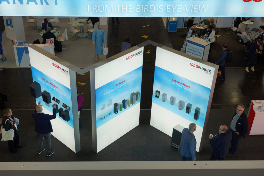 Der 90 m² große Stand war vollgepackt mit Innovationen für das Gesundheitswesen: Vom ingo-man® über verschiedene Kartuschenlösungen der KX- und Neptune-Serie bis hin zum Hotelspender H3 konnten Besucher hier Spendersysteme aus dem Hause OPHARDT kennenlernen. Der Mix aus etablierten Produkten und Neuheiten des Sortiments traf auf vielseitiges Interesse.