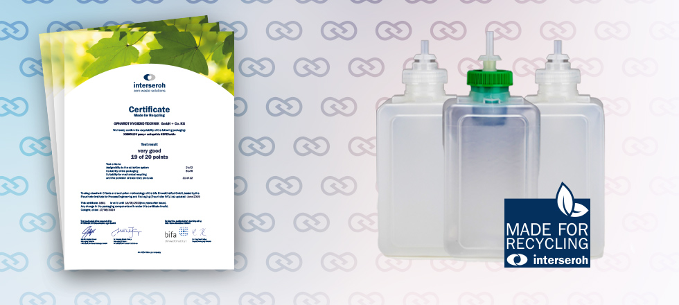 Zusammen mit der hygienischen DHP Einwegpumpe, die inklusive ihrer Verpackung bereits erfolgreich zertifiziert wurde, tragen die nun getesteten Produkte das Gütesiegel „Made for Recycling“. Die von der INTERSEROH Dienstleistungs GmbH vergebene Auszeichnung, erhalten nur Produkte, die im Rahmen einer umfassenden Analyse mindestens 18 von 20 möglichen Punkten erzielen. Die wissenschaftlich fundierten Analyse- und Bewertungskriterien wurden gemeinsam mit dem bifa Umweltinstitut entwickelt und abschließend vom Fraunhofer-Institut für Verfahrenstechnik und Verpackung (IVV) überprüft – zwei renommierte Institutionen.